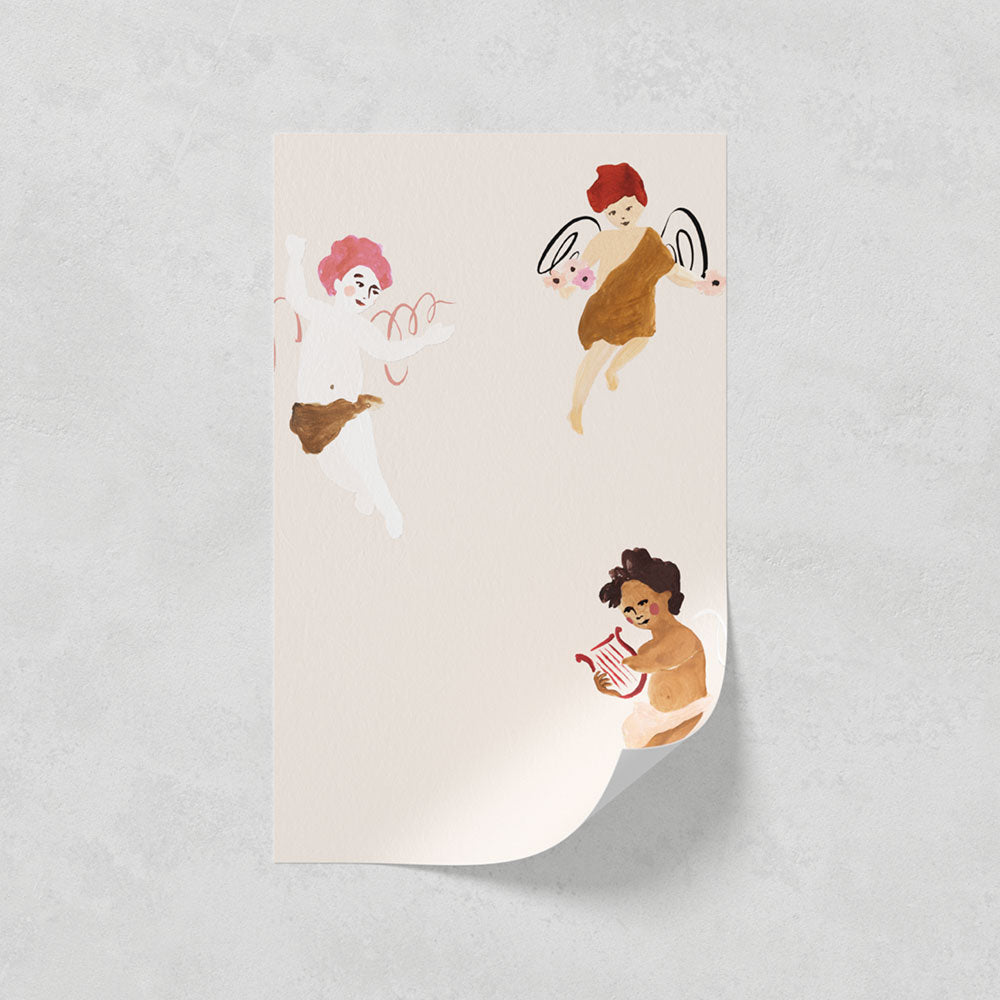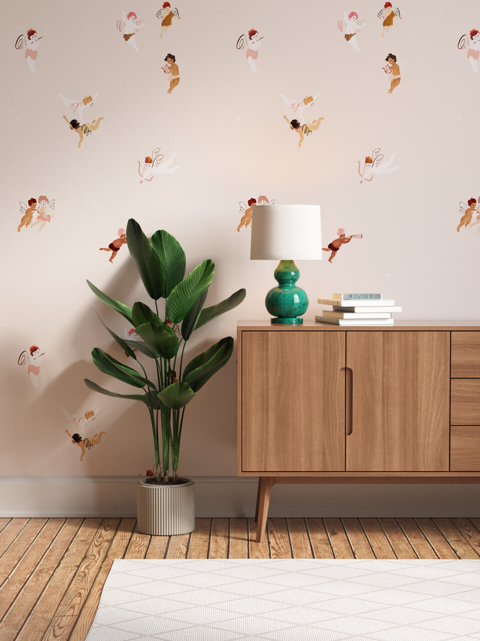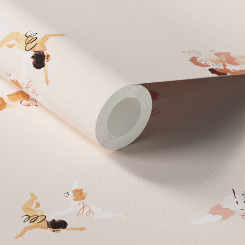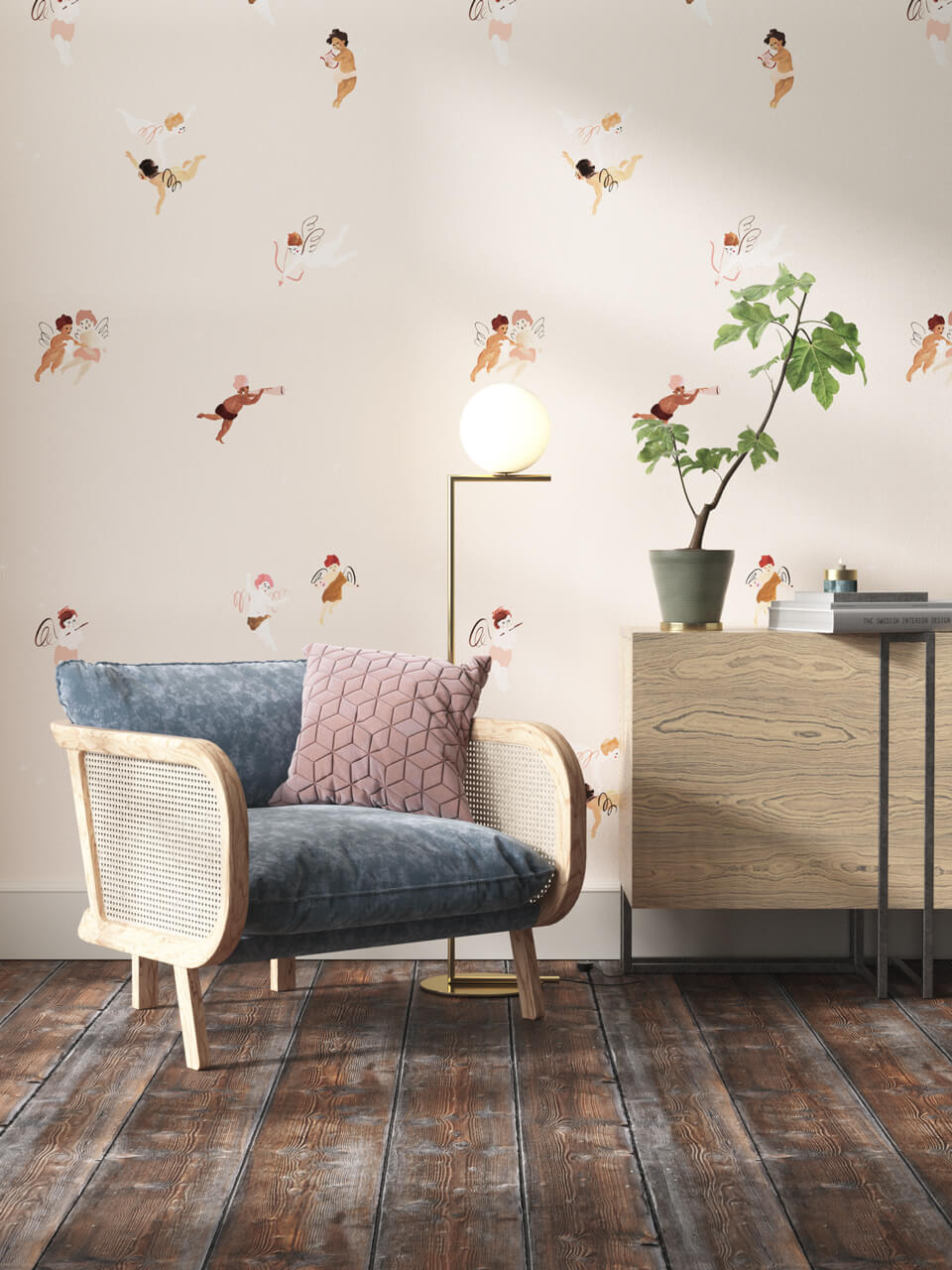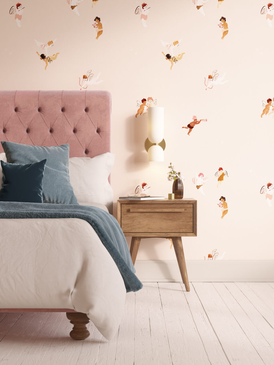 Cherub 01 is a soft pink wallpaper illustrated with hand-painted cherubs. Give classic decor a modern twist with this easy, paste-the-wall wallpaper.
