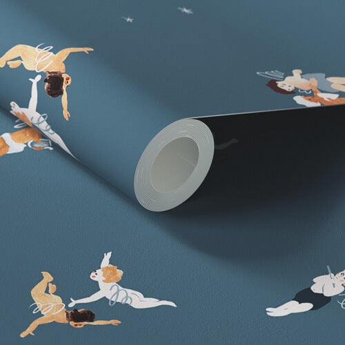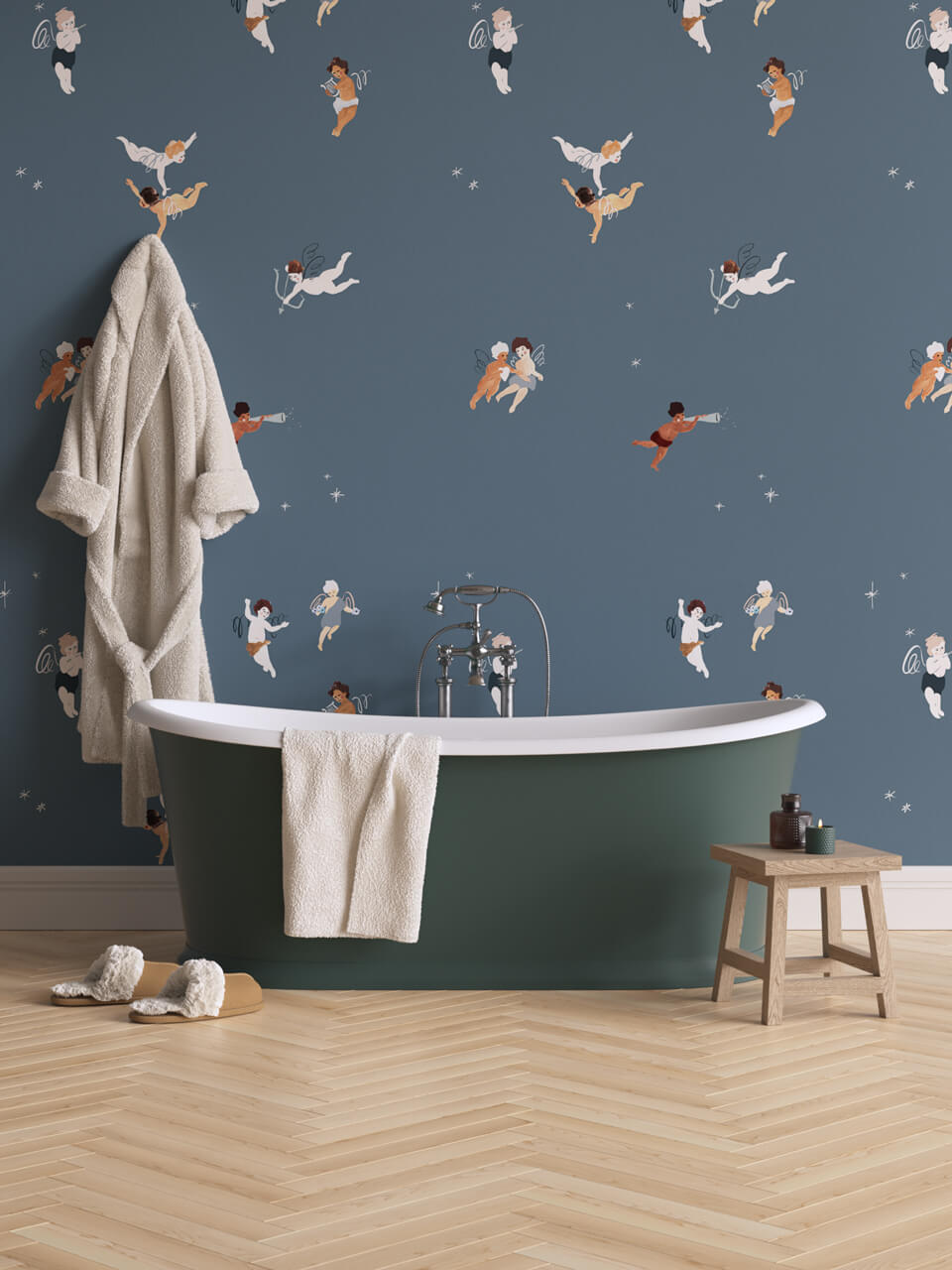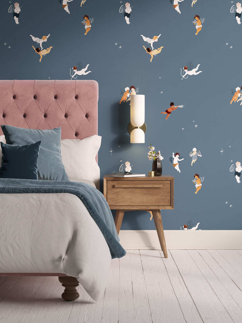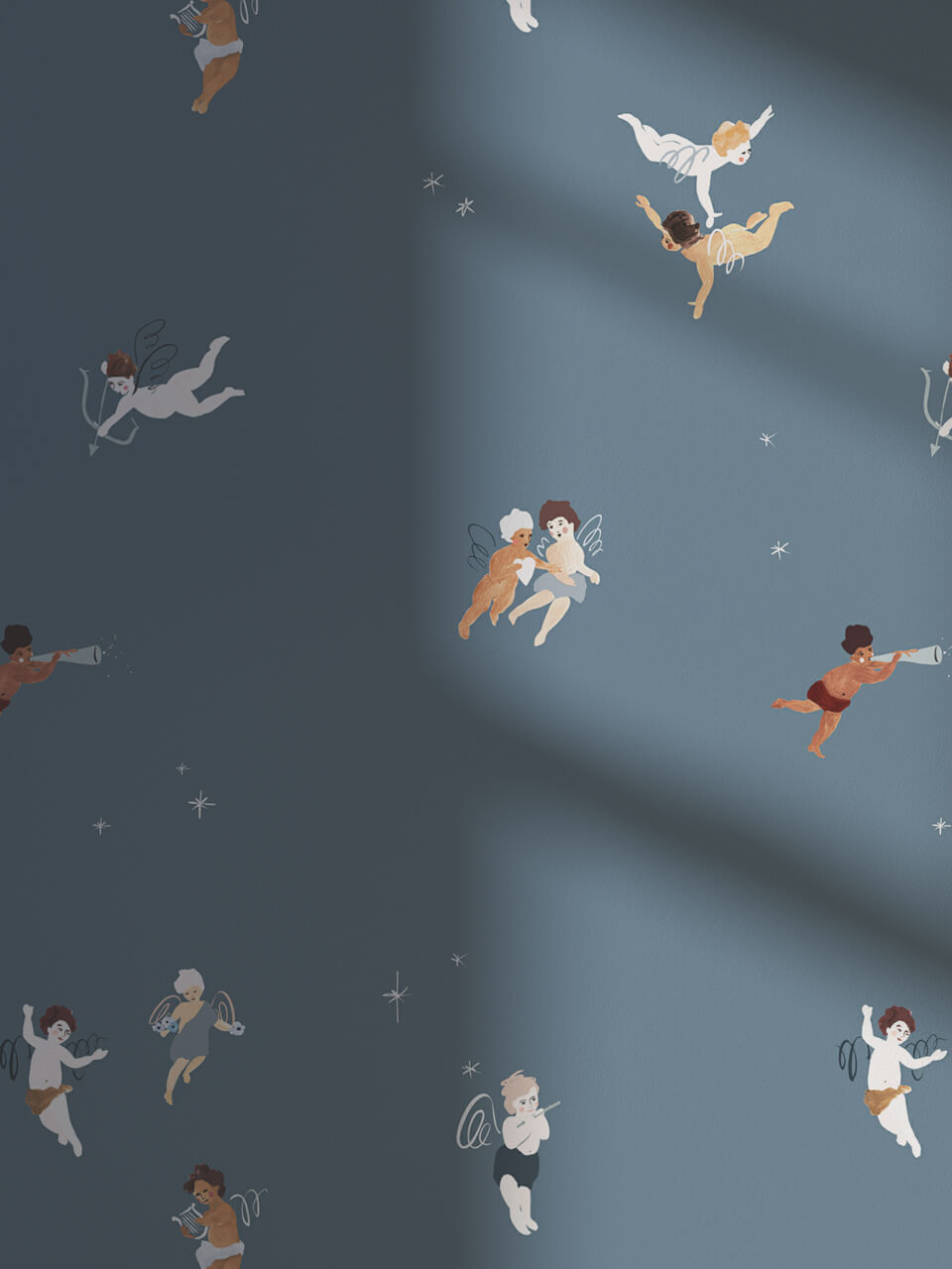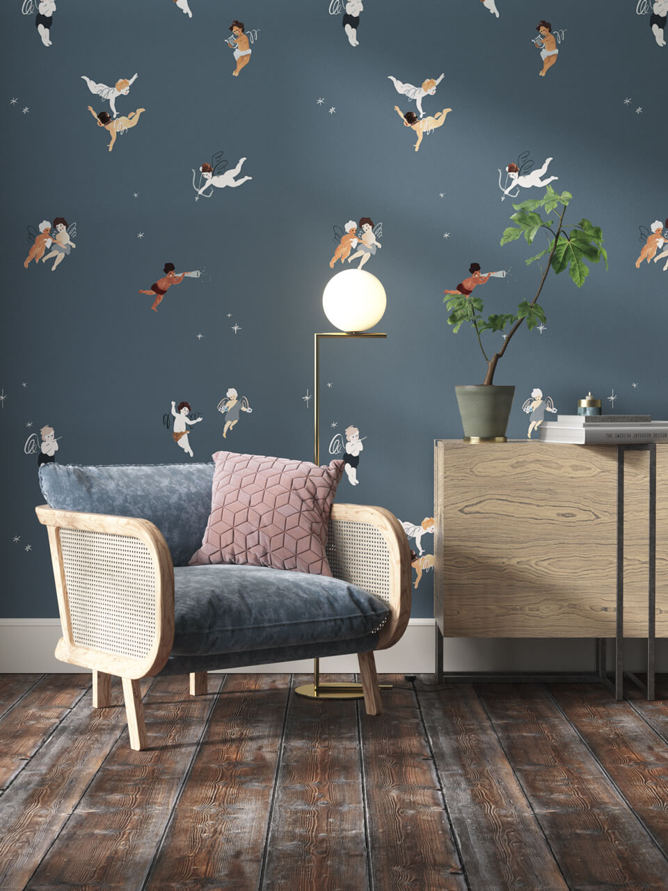 Cherub 03 is a navy blue wallpaper illustrated with hand-painted cherubs. Give classic decor a modern twist with this easy, paste-the-wall wallpaper.