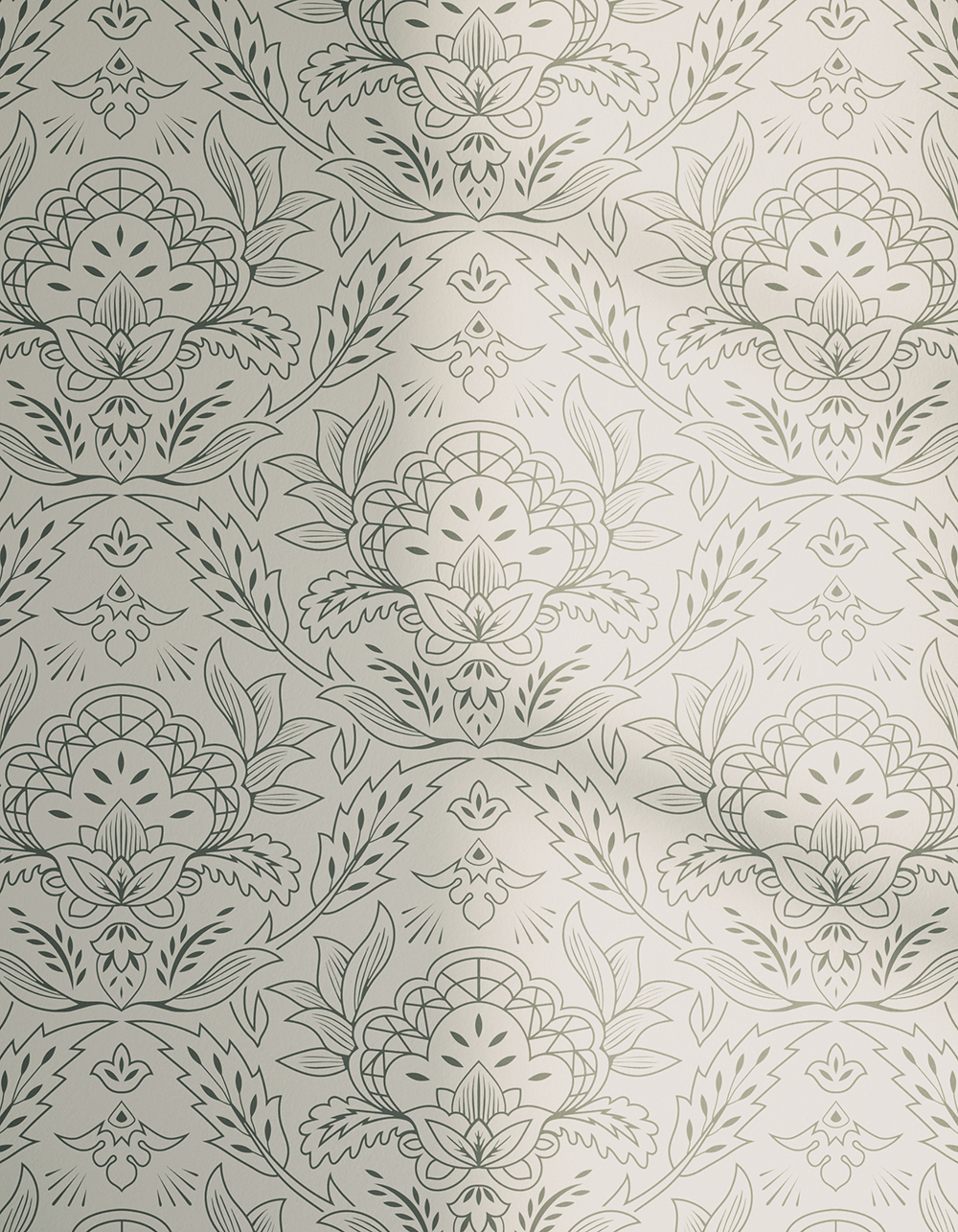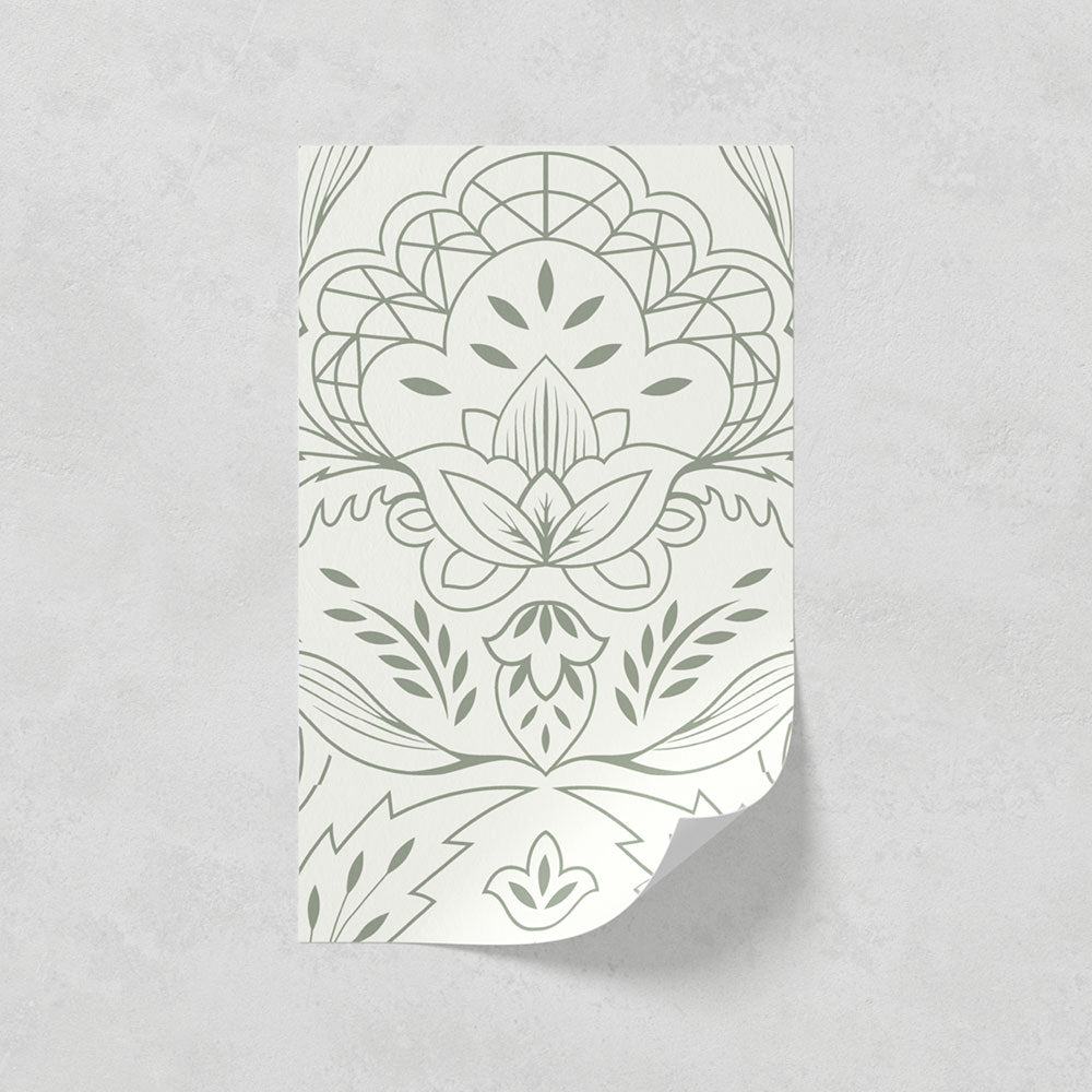 Lick Damask 01 Wallpaper shows art nouveau style damask print designed in Green 02 and White 03 and is printed on fine grade Toll Coated Non-Woven paper.