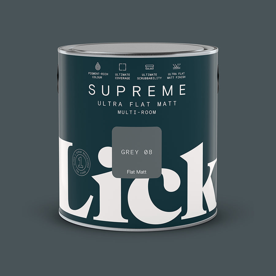 Dark grey is here to stay. A trend that's proved it's a keeper, Grey 08 dives in at the deep end. As a dark, charcoal grey, it mixes warm and cool undertones to produce a balanced grey to suit all spaces, with a matt finish that won't reflect shine.