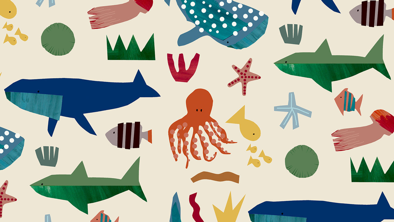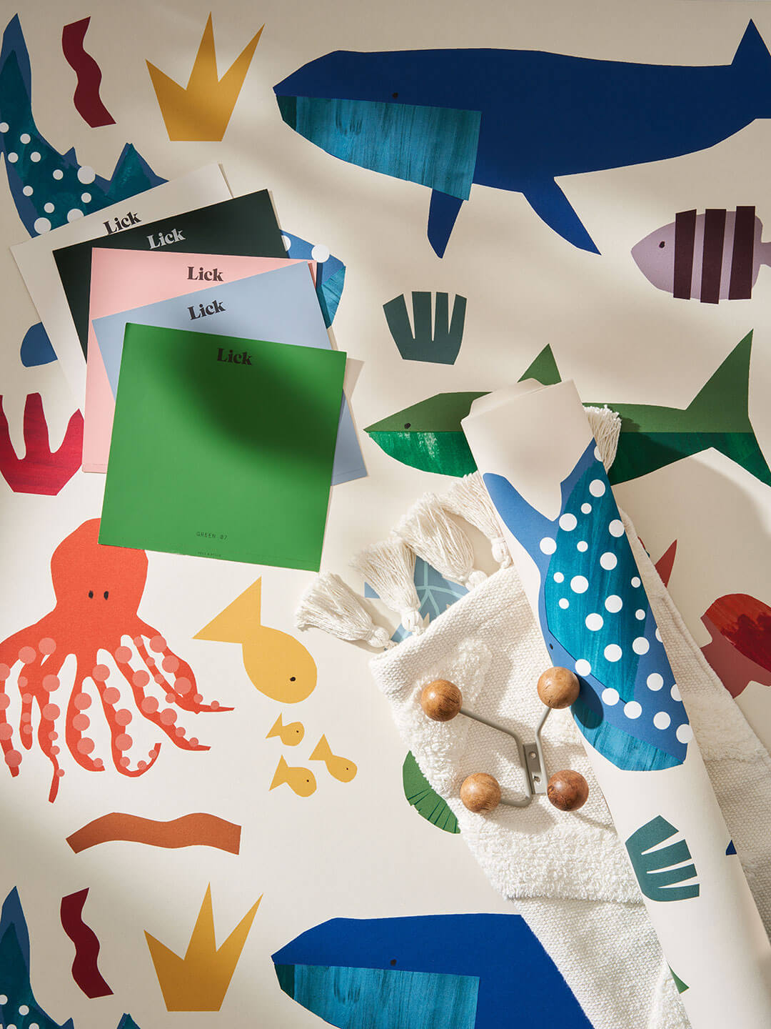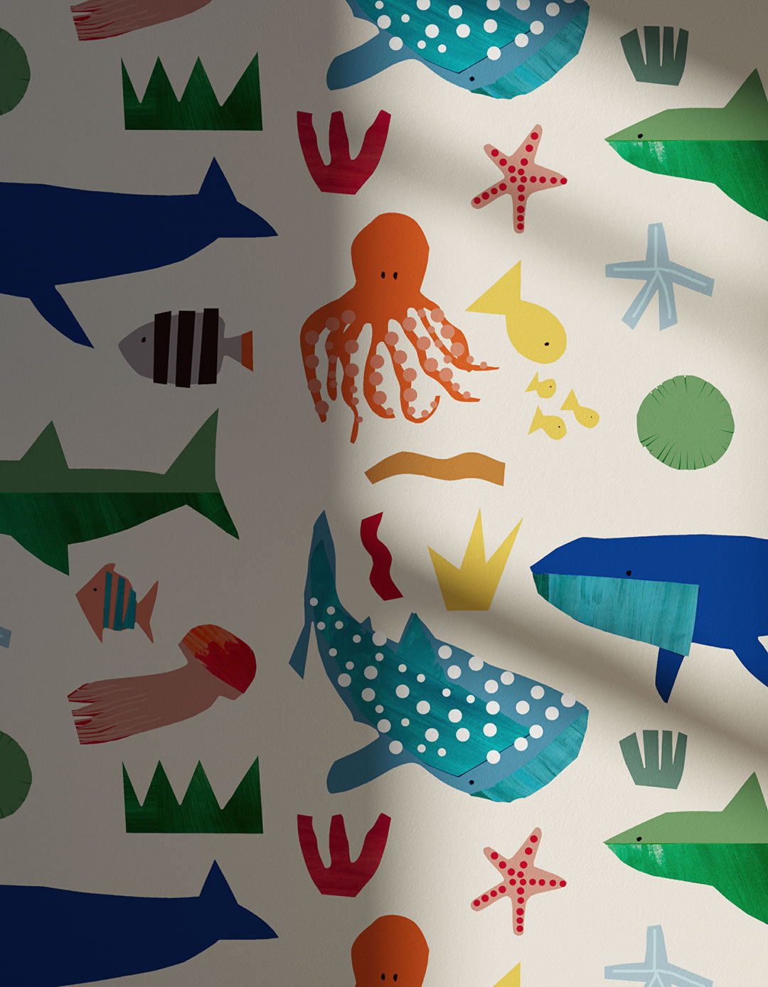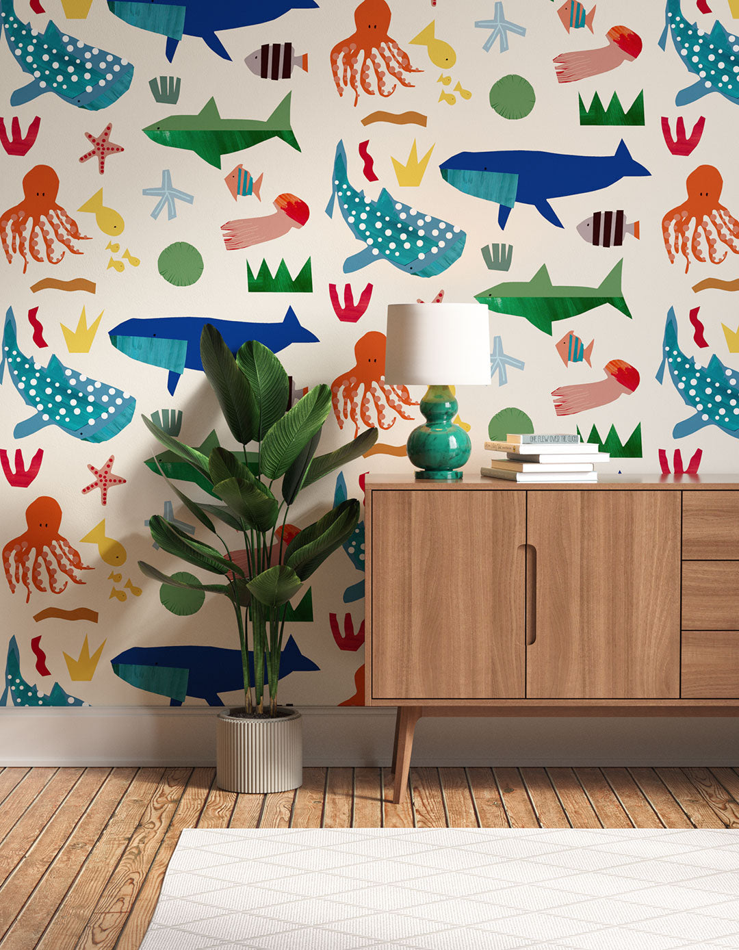 Celebrate all things in the ocean world with Marine 02, our under the sea nursery wallpaper. Set against a sandy background, colourful starfish dip and dodge between friendly whales and sharks for an energetic scene of blues, greens and pinks. Available in a paste-the-wall roll and sample.